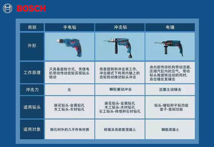 首頁>五金資訊>常見問題>亮河電工工具小知識(shí)-博世手電鉆、沖擊鉆、電錘、傻傻分不清楚?