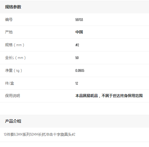 產(chǎn)品名字:世達(dá)10件套6.3MM系列50MM長抗沖擊十字旋具頭#2