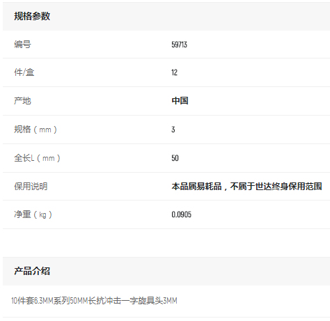 產(chǎn)品名字:世達10件套6.3MM系列50mm長一字旋具頭3MM