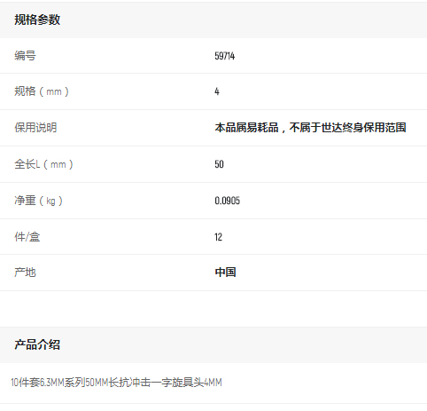 首頁>產(chǎn)品中心>螺絲批>旋具頭>世達(dá)10件套6.3MM系列50mm長一字旋具頭4MM