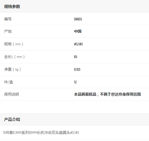 產(chǎn)品名字:世達(dá)10件套6.3MM系列65MM長抗沖擊雙頭旋具頭#3/#3